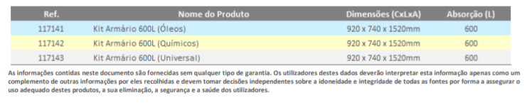 Os armários de 600L são recomendados para o armazenamento de vários tipos de produtos dedicados à absorção, contenção, prevenção e eliminação de líquidos em total segurança. As suas rodas e o acesso fácil fazem deste Kit um elemento importante em armazéns com áreas com risco de derrame. Devido ao seu conteúdo diverso, este produto é essencial para qualquer sistema de gestão ambiental, segundo a norma ISO 14001.