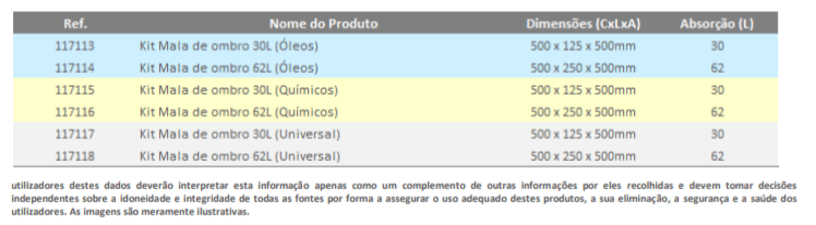 As Malas de ombro 30/62L são recomendadas para o armazenamento de vários tipos de produtos dedicados à absorção, contenção, prevenção e eliminação de líquidos em total segurança. A sua portabilidade torna-as num kit de acesso fácil e rápido, sendo, por isso, um elemento importante em armazéns com áreas com risco de errame. Devido ao seu conteúdo diverso, este produto é essencial para qualquer sistema de gestão ambiental, segundo a norma ISO 14001.